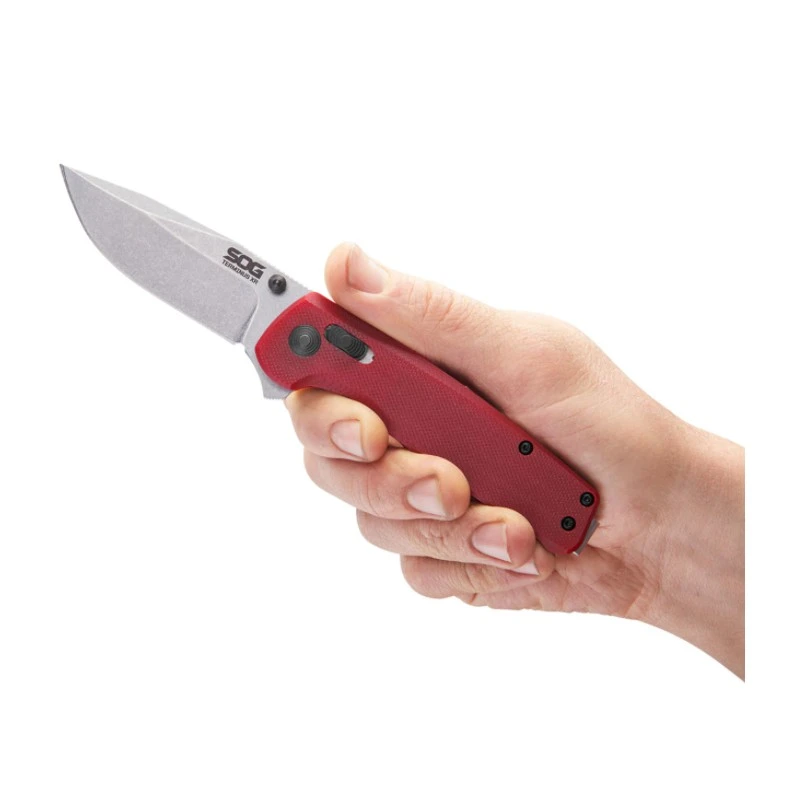 Voici le Couteau Terminus XR Crimson de chez SOG qui possède une lame lisse de 7.5cm en acier inoxydable D2 avec une finition stonewash et un manche de couleur rouge en G-10 (fibre de verre).