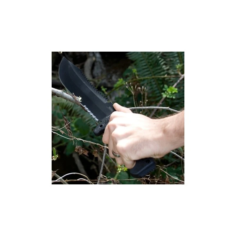 Sa lame en 8Cr13MoV de 24.1cm Noir est semi-dentelée.