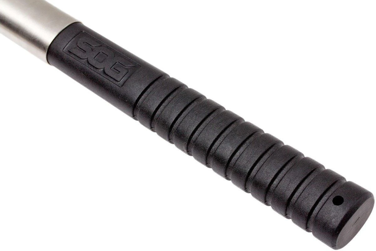 La SOG Camp Axe est une hache de camping légère. La tête en acier inoxydable 2Cr13 a été conçue intelligemment. Là où on a besoin de force et du poids, la tête est épaisse, puis le reste est plus fin. Une hache fonctionnelle et au poids pas trop embêtant tout de même. Elle se glisse facilement dans un sac à dos. Une sorte de grande encoche permet également de bien saisir la hache près de la tête. Du coup, préparer des hérissons à partir de bois fraîchement fendu est ultrasimple avec la Camp Axe. La tige est en FRN. Une sensation de plastique, mais en fait c’est hyper costaud ! FRN signifie Fiber Reinforced Nylon. Du nylon renforcé de fibre, dans la langue de Molière. Le manchon en acier qui entoure la tige protège cette dernière si vous ratiez votre coup.