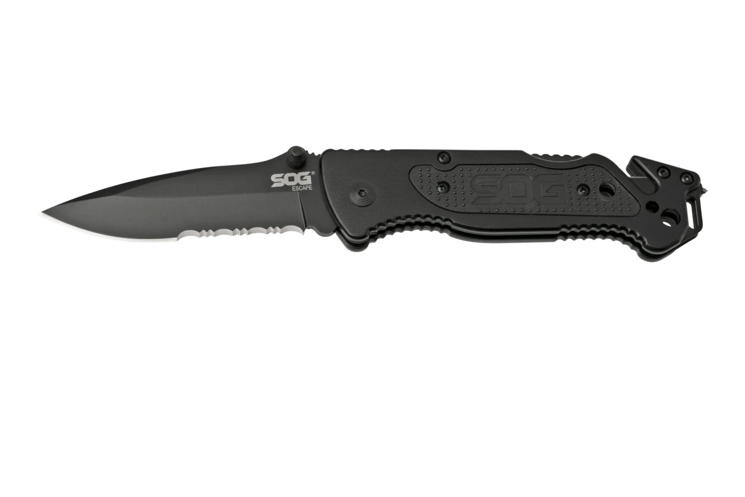 Le SOG Escape est un couteau de poche EDC pratique, doté de plusieurs fonctions. Sous le manche, on trouve un brise-vitre et un crochet de coupe, très utiles pour les agents de premiers secours. Le manche du SOG Escape étant fait en aluminium, ce couteau est très léger. On le porte facilement sur soi au quotidien. On ouvre la lame grâce au repose-pouce, puis elle est maintenue ouverte par un backlock solide.