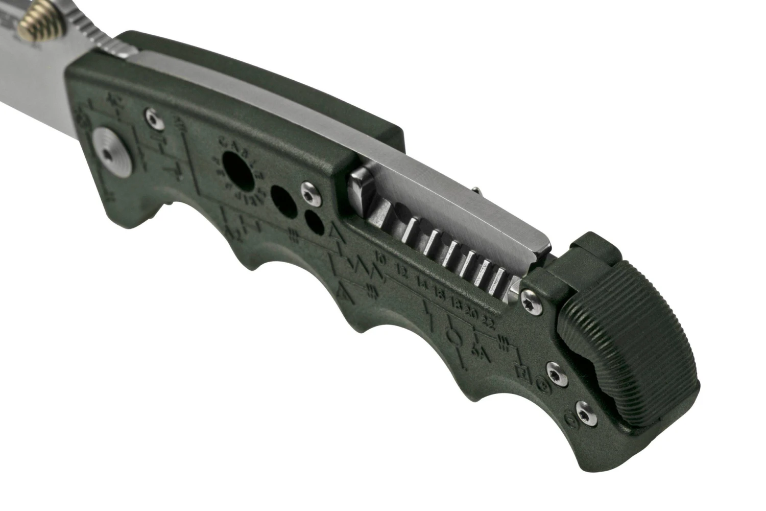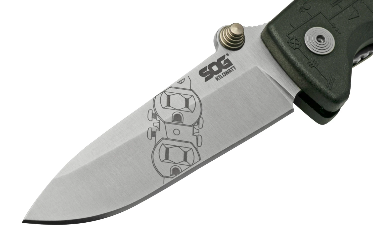 Le SOG Kilowatt est un couteau de poche EDC très pratique, dotĂ© de fonctions supplĂ©mentaires qui en font le couteau idĂ©al pour les Ă©lectriciens. Ainsi, on trouve, dissimulĂ© sous le manche, un dĂ©nudeur de câble UTP ainsi qu’un coupe-fil au milieu du manche. Il y a Ă©galement un dĂ©nudeur classique derrière le manche, pour des câbles de 10 Ă 22. Le manche est dotĂ© d’empreintes pour les doigts, qui permettent de bien l’avoir en main. La lame et le manche sont tous deux dĂ©corĂ©s de gravures assorties.